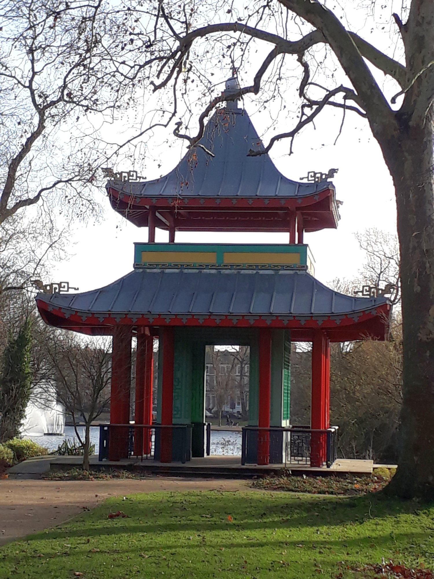 On a commencé par le parc Victoria dans lequel se déroulait une course de Pères Noël. Il y en avait des centaines qui couraient 5 ou 10 kms pour différentes associations caritatives. On a fait un petit tour du parc autour du lac où on a vu une pagode chinoise et plein d’oiseaux. Puis on a traversé un premier marché de nourriture avec beaucoup de food trucks. Ça avait l’air bien bon mais c’était surtout bien cher. C’était pas grave car il était trop tôt pour manger (on a quand même pris une baguette… ça nous manquait). L’été, ça doit être bien sympa d’acheter sa bouffe et de se poser dans le parc…