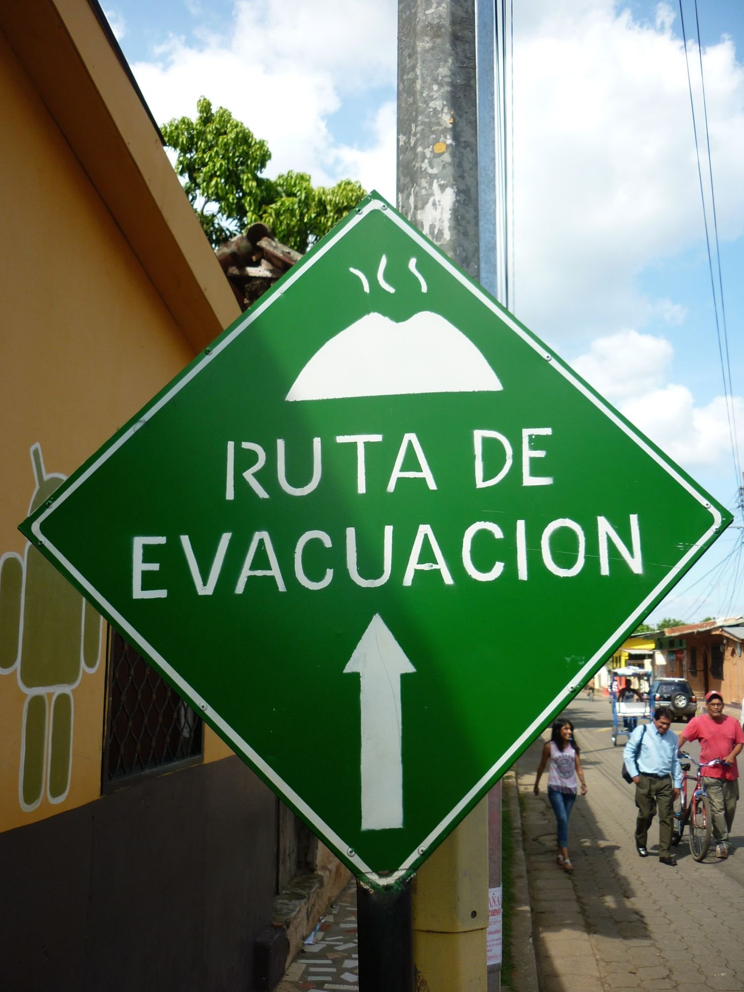 Mais, nous avons adoré une chose : ce bar au milieu d’un parc avec des tables en bois colorées et démesurées. Il propose des cocktails de fruits frais délicieux préparés à la demande. Un régal ! J’ai aussi apprécié une coupe de cheveux à 75 centimes. Plus intéressante que la ville elle-même, l’intérêt de Masaya, c’est son volcan, l’un des plus actif du pays. Donc cela nécessite quelques précautions comme ce panneau indicateur*.