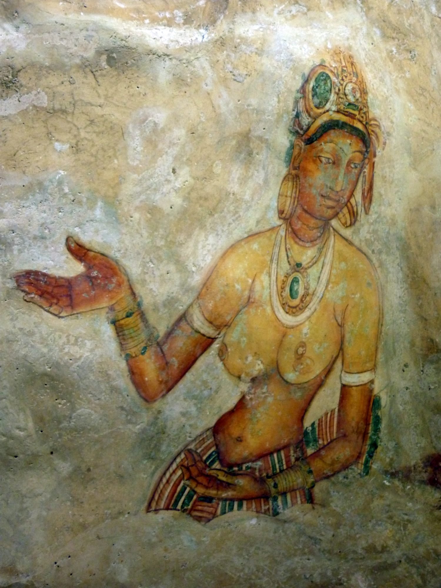 On arrive par la partie sud du rocher qui oblige à passer par un chemin encadré de rochers qui permettaient de contrôler les arrivées à l’époque. On monte pas mal de marches* (il y en a 1200 en tout) pour atteindre une large cavité du rocher. Sur les parois, vingt-et-une femmes qui pourraient être les courtisanes ou des danseuses célestes sont peintes. Une dizaine est étonnamment bien conservée. Il est aujourd’hui interdit de prendre des photos. Mais en 2011, on pouvait alors je partage mes clichés :